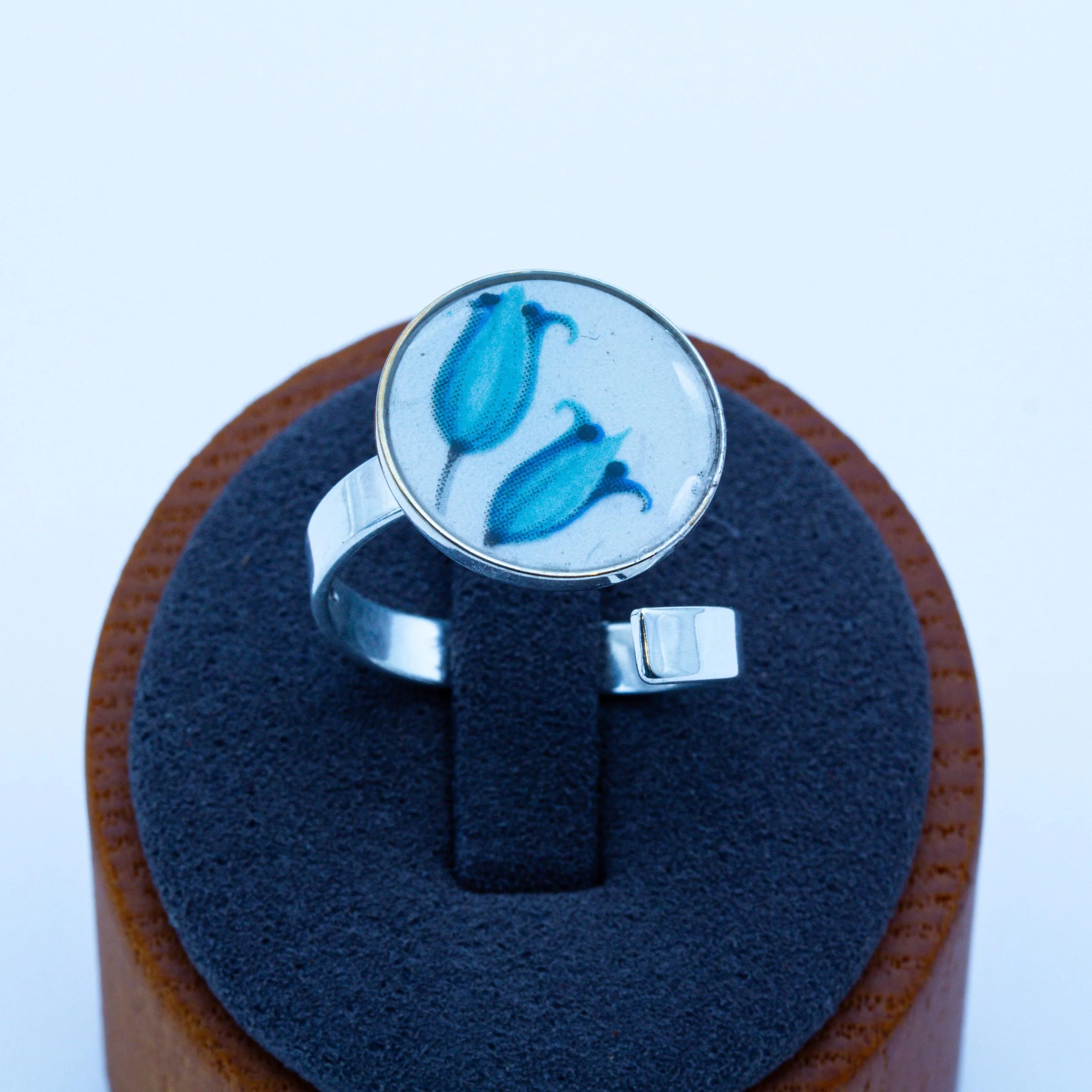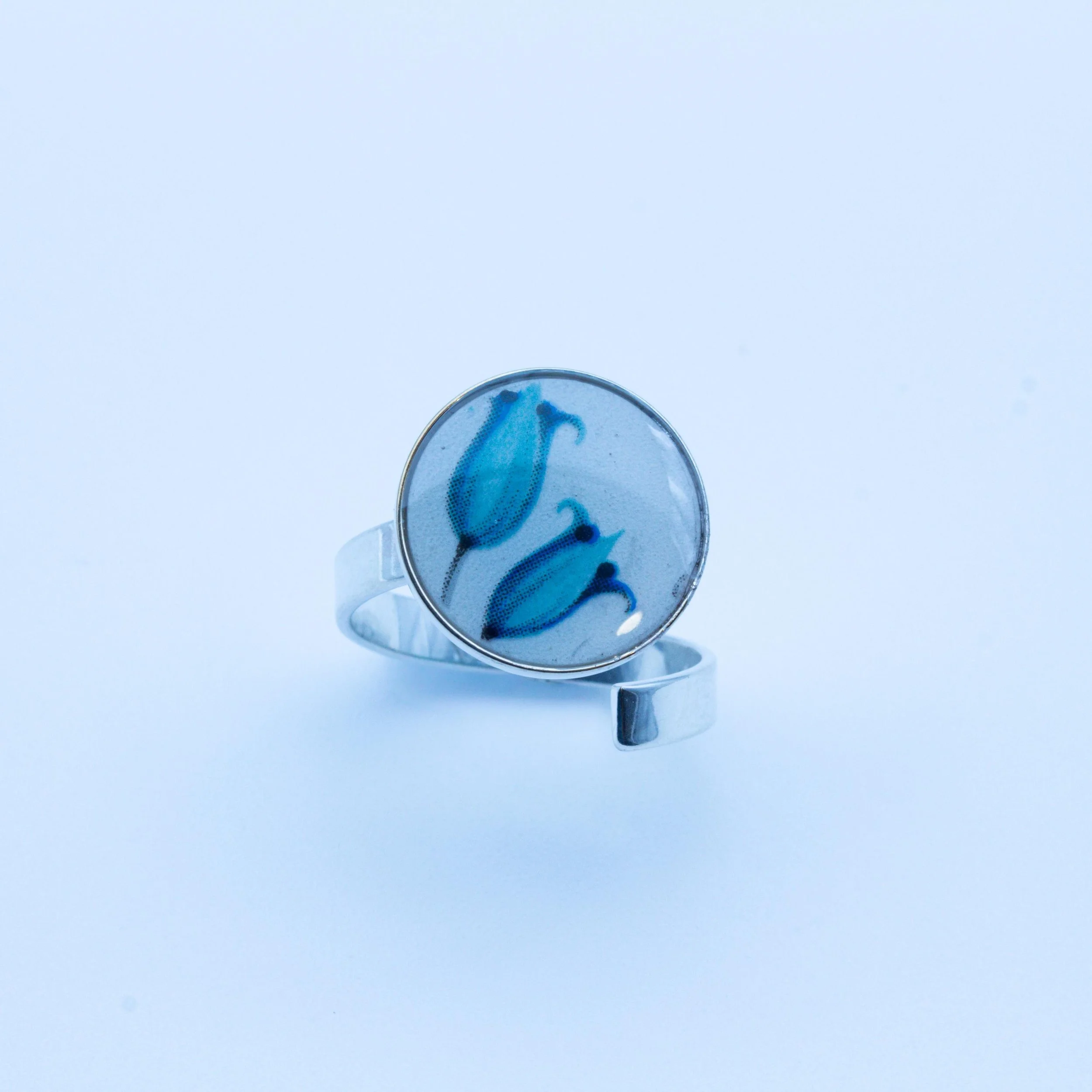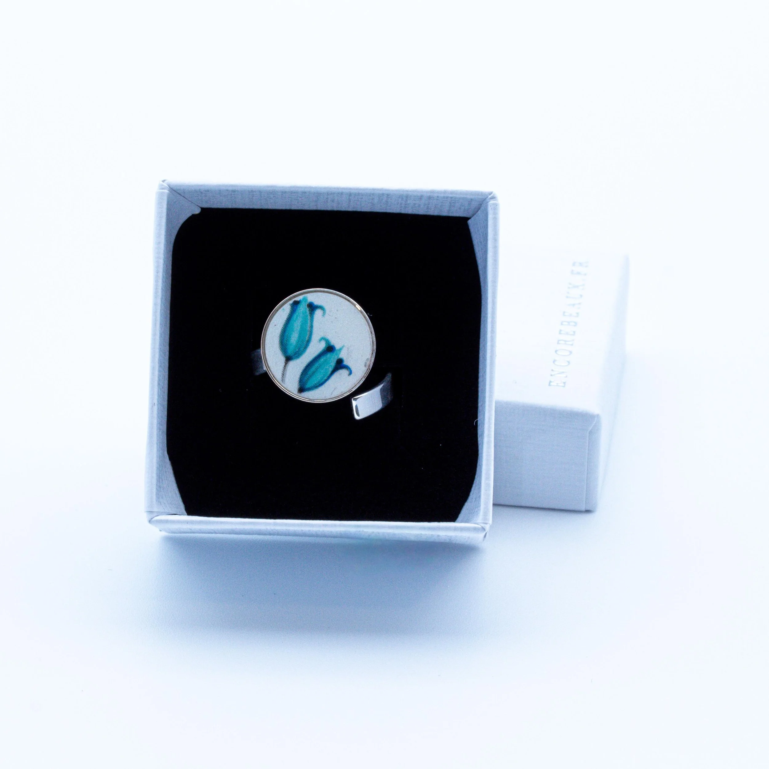 Bague en argent massif et faïence de Saint-Amand-les-Eaux, tulipes bleues, bijou artisanal français
