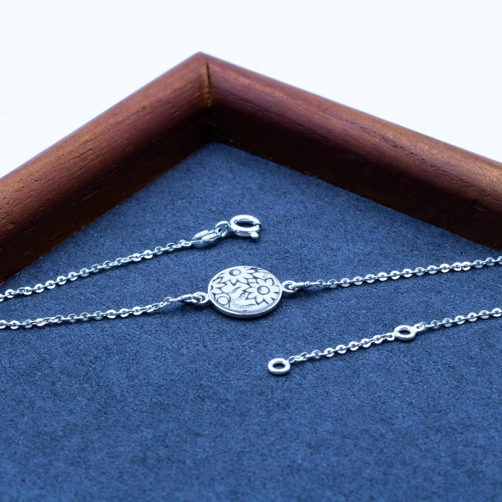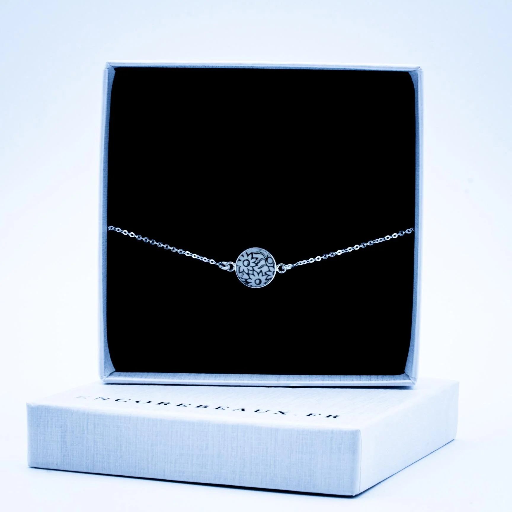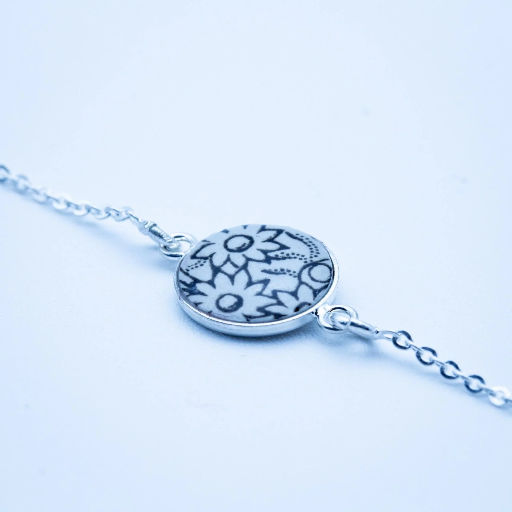 ce bracelet est composé d’un médaillon rond en faïence anglaise ancienne, orné d’un décor floral graphique et délicat. la faïence est découpée et ajustée à la main, puis protégée par une résine transparente qui en révèle les détails et les contrastes. montée sur une chaîne en argent 925, cette pièce se porte facilement au quotidien et apporte une touche subtile d’histoire et de poésie au poignet.