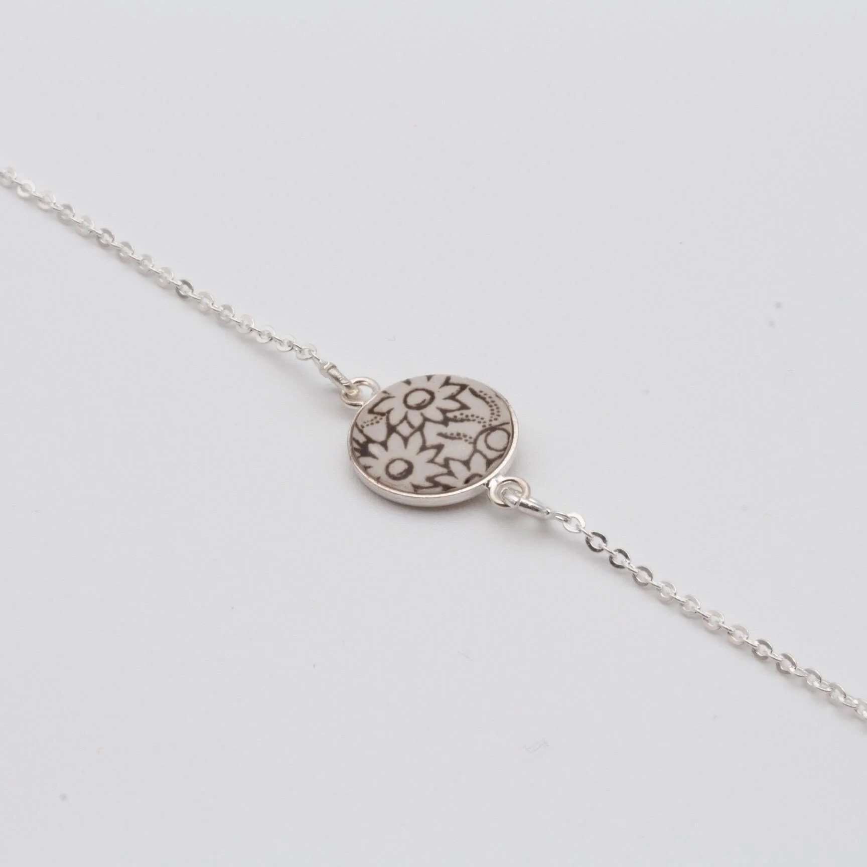 – fragment de vaisselle anglaise ancienne soigneusement sélectionné – motif floral ancien au dessin graphique – faïence découpée et ajustée à la main – bracelet fin et facile à porter au quotidien